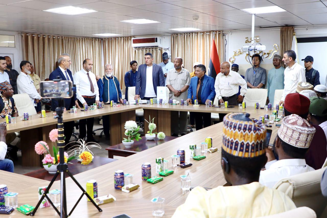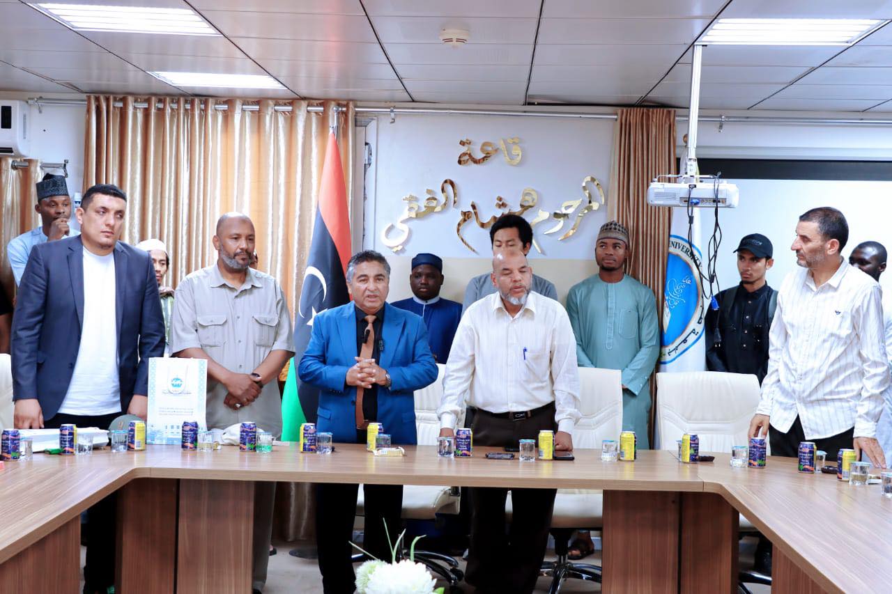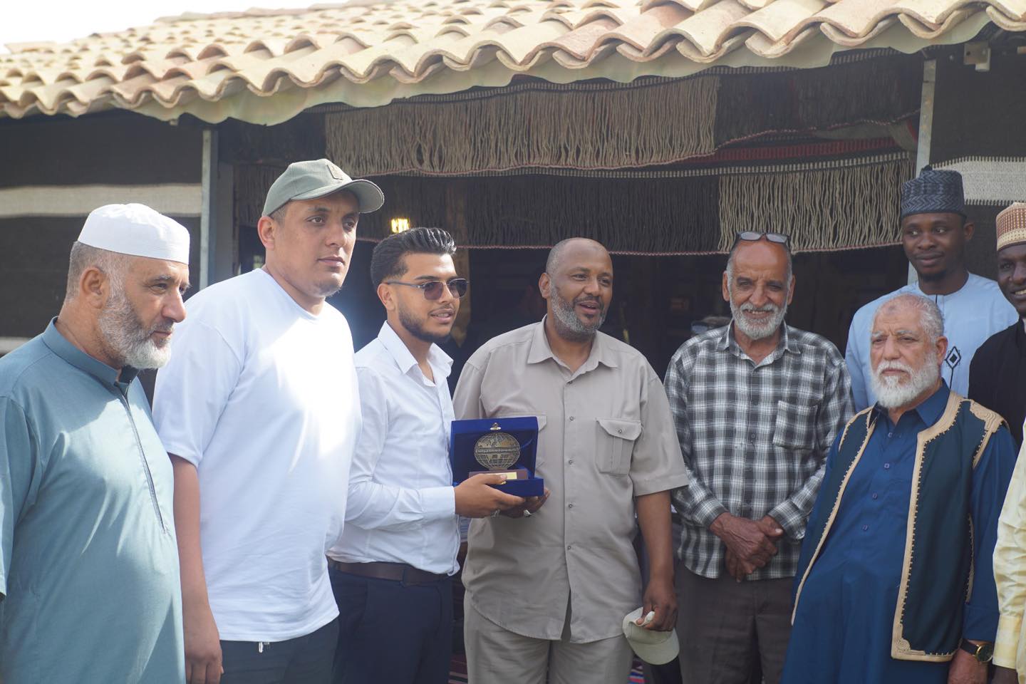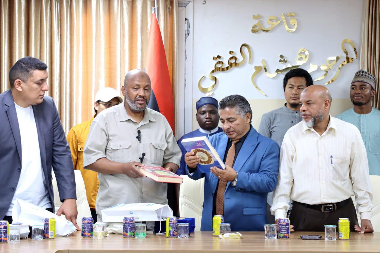 They were warmly received by Dr. Salem Al-Hrishi, Dr. Ahmed Aoun, Dr. Al-Hadi Bouljam, Dr. Walid Shwaya, and Dr. Ahmed Al-Muntasir, who welcomed the guests with great hospitality. A shield was presented by the College of Islamic Call along with several issues of its magazine.
