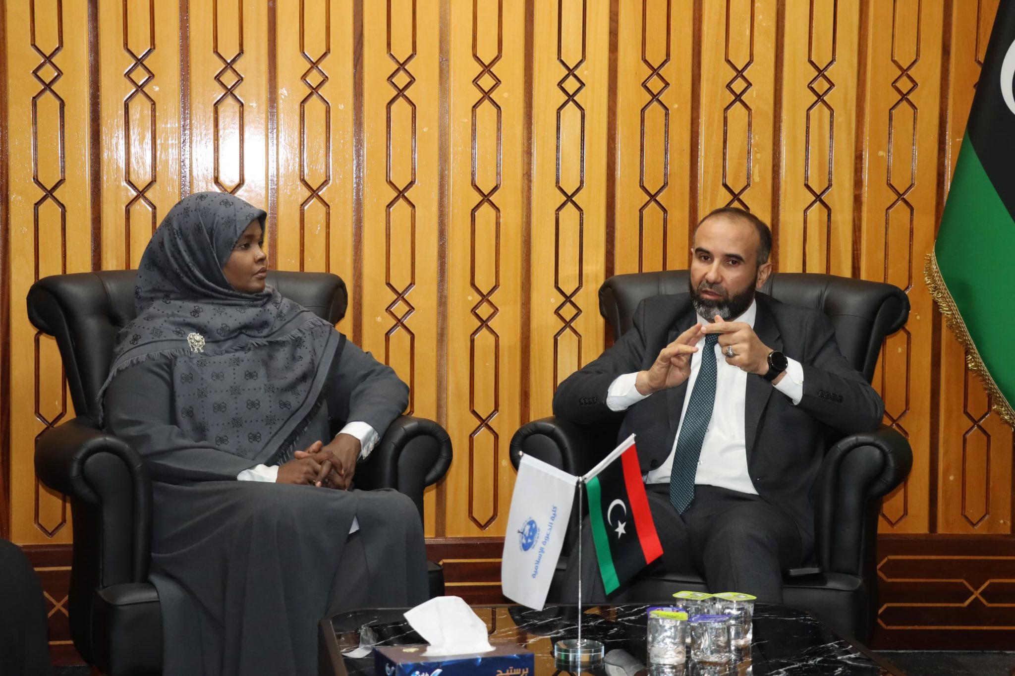 في زيارة غير مسبوقة تشرفت أسرة كلية الدعوة الإسلامية عميدا ورؤساء الأقسام العلمية بالكلية والسيد رئيس قسم الدراسات العليا المكلف ومسجل الكلية حيث استقبل السيد الدكتور أبوبكر محمد أبوسوير عميد كلية الدعوة الإسلامية صبيحة اليوم الثلاثاء الموافق 2\12\2025 السيدة وزيرة الثقافة والتنمية المعرفية والوفد المرافق لها وتضمن اللقاء زيارة تعريفية لكل مرافق الكلية ونتج عنه أيضا الاتفاق على إبرام مذكرة تفاهم في عقد مؤتمر الثقافات المتعددة في الكلية من أفريقية وآسوية وأوروبية وأمريكية، وكذا الأنشطة الثقافية التي تخدم الطلبة بثقافاتهم المختلفة، والعمل على قراءة كتب التراث المطبوعة داخل الكلية.